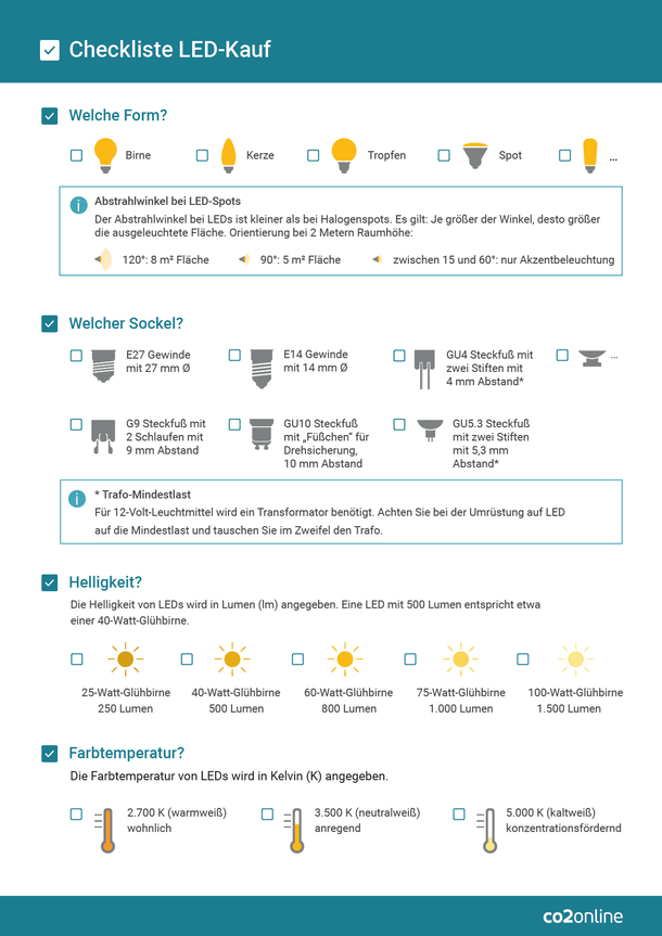 Diese Checkliste hilft Ihnen dabei, Glühbirnen oder Halogenlampen an jedem Einsatzort mit der passenden LED zu ersetzen. Zum Ausdrucken oder Herunterladen. Alle Infos zu Form, Sockel, Helligkeit und Farbtemperatur finden Sie im Artikel „Energiesparlampe oder LED”.